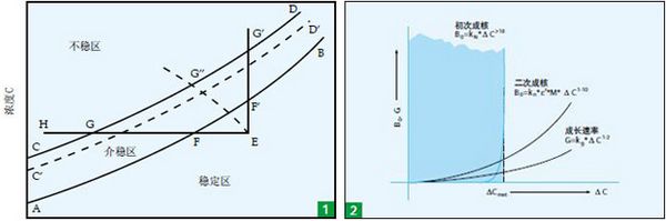 根據(jù)大量試驗(yàn)的結(jié)果證實(shí),溶液的過飽和與結(jié)晶的關(guān)系可用上圖1表示;圖中的AB 線為普通的溶解度曲線,CD 線代表溶液過飽和而能自發(fā)地產(chǎn)生晶核的濃度曲線( 超溶解度曲線),它與溶解度曲線大致平行。這兩根曲線將濃度——溫度圖分割為三個(gè)區(qū)城。在 AB 曲線以下是穩(wěn)定區(qū),在此區(qū)中溶液尚未達(dá)到飽和,因此沒有結(jié)晶的可能。AB 線以上為過飽和溶液區(qū),此區(qū)又分為兩部分:在 AB 與 CD 線之間稱為介穩(wěn)區(qū),在這個(gè)區(qū)域中,不會(huì)自發(fā)地產(chǎn)生晶核,但如果溶液中已加了晶種, 這些晶種就會(huì)長(zhǎng)大。 CD 線以上是不穩(wěn)區(qū),在此區(qū)域中,溶液能自發(fā)地產(chǎn)生晶核。若原始濃度為 E 的潔凈溶液在沒有溶劑損失的情況下冷卻到 F 點(diǎn),溶液剛好達(dá)到飽和,但不能結(jié)晶,因?yàn)樗€缺乏作推動(dòng)力的過飽和度。從F 點(diǎn)繼續(xù)冷卻到 G 點(diǎn)的一段期間,溶液經(jīng)過介穩(wěn)區(qū),雖已處于過飽和狀態(tài),但仍不能自發(fā)地產(chǎn)生晶核。只有冷卻到 G點(diǎn)后,溶液中才能自發(fā)地產(chǎn)生晶核,越深入不穩(wěn)區(qū)(例如達(dá)到 H 點(diǎn)),自發(fā)產(chǎn)生的晶核也越多。由此可見,超溶解度曲線及介穩(wěn)區(qū)、不穩(wěn)區(qū)這些概念對(duì)于結(jié)晶過程有重要意義。把溶液中的溶劑蒸發(fā)一部分,也能使溶液達(dá)到過飽和狀態(tài),圖中 EF ’ G’線代表此恒溫蒸發(fā)過程。在工業(yè)結(jié)晶中往合并使用冷卻和蒸發(fā),此過程可由 EG’’線代表。